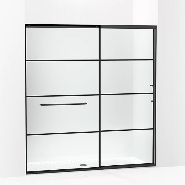 Kohler Elate® Sliding shower door (68.3" - 71.6"W x 75.5" H) with heavy 5/16" (8mm) thick glass with Rectangular Grille Pattern in Matte Black - Crystal Clear is backordered and will ship as soon as it is back in stock.