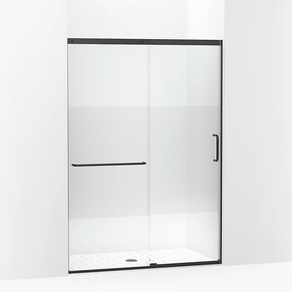 Kohler Elate® Sliding shower door (50.3" - 53.6" W x 75.5" H) with heavy 5/16" (8mm) thick Crystal Clear glass with privacy band - matte-black is backordered and will ship as soon as it is back in stock.
