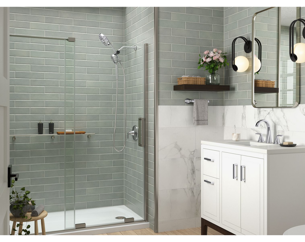 Bringing new technology and sleek style to the contemporary bath, Echelon shower doors feature a unique design, including a bottom roller system for a smooth, quiet difference you can feel. The unconstrained head clearance means no ducking down for taller people when entering the showering space, and with the innovative SealNetik™ full-length magnetic seal, you can be assured your door closes securely to provide you with superior water containment. Vertical back-to-back ladder handles complement Echelon's modern minimalist look. Welcome to an open, inviting showering space.