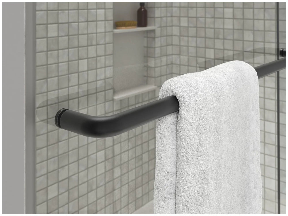 • Gently-curved towel bar provides integrated storage on fixed panel
